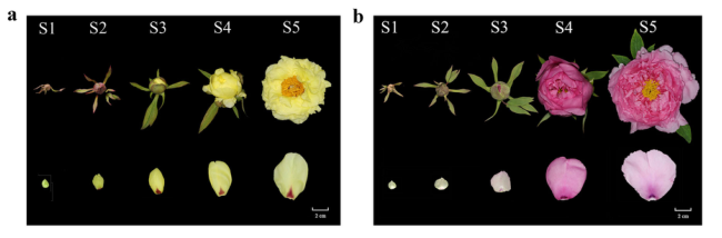 為表征樹牡丹花色發(fā)育情況,以黃花品種“海黃”和紫紅花品種“肉芙蓉”為研究對象,在花蕾早期至盛開的S1-S5共5個(gè)發(fā)育階段對兩個(gè)品種的花瓣組織進(jìn)行了取樣,用于測定花瓣顏色指數(shù),在“海黃”中發(fā)現(xiàn)L *(明度)值從S1到S5逐漸增加,這表示花瓣顏色明度升高。C *(色度)和b *(黃色)在S3達(dá)到峰值,隨后在S4和S5下降,證明S3是顏色最黃的階段。而“肉芙蓉”在整個(gè)開花過程中沒有觀察到L *的顯著變化。在S1到S5階段,“肉芙蓉”中b *顯著低于“海黃”。同樣,“肉芙蓉”中a *(紅色)比“海黃”要高得多。