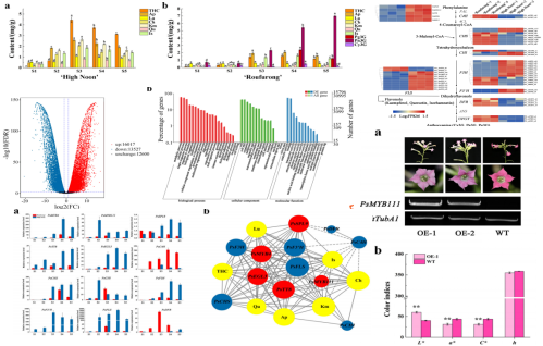 亞細(xì)胞定位分析與轉(zhuǎn)基因?qū)嶒?yàn)結(jié)果進(jìn)一步驗(yàn)證了上述基因的關(guān)鍵作用:亞細(xì)胞定位分析顯示PsMYB111定位于細(xì)胞核,表明PsMYB111可能在細(xì)胞核中發(fā)揮TF的作用。PsMYB111在煙草中的過表達(dá)使其花顏色由玫瑰紅變?yōu)闇\粉色。轉(zhuǎn)基因煙草株系中Km、Qu等黃酮醇含量顯著增加,而Pg3G、Pn3G等花青素含量顯著降低,證實(shí)了其在黃色牡丹花著色中的作用。此外,在GhMYB1a過表達(dá)的轉(zhuǎn)基因煙草株系中,NtCHS、NtF3H和NtFLS的表達(dá)顯著上調(diào),GhMYB1a顯著激活了非洲菊GhDFR和GhMYB10的NtCHS和NtFLS啟動子。同樣,PsMYB111對PsCHS和PsFLS啟動子,尤其是PsFLS有顯著的激活作用。