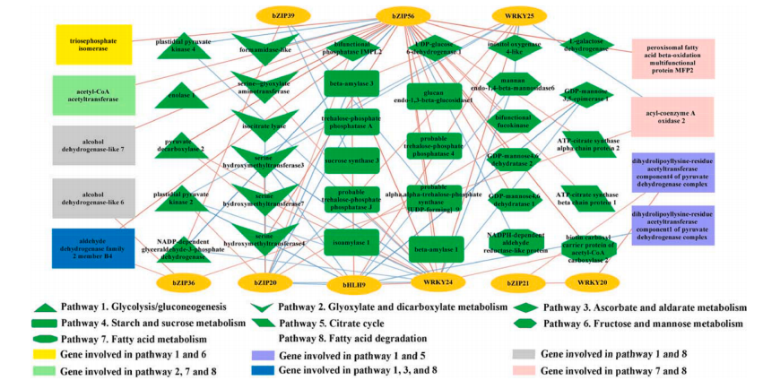 該研究對中國7個(gè)地區(qū)突尼斯石榴的代謝組和轉(zhuǎn)錄組、風(fēng)味相關(guān)屬性和揮發(fā)性化合物進(jìn)行了研究。7個(gè)不同種植區(qū)的石榴,糖、有機(jī)酸和維生素c含量存在顯著差異。所有樣品共鑒定了40種揮發(fā)性化合物,其中13種揮發(fā)性化合物。所有樣品中有4種化合物含量較高,包括1-己醇、(Z)-3-己烯醇、α-松果醇和2,4-二叔丁基苯酚,是影響石榴香氣品質(zhì)的主要貢獻(xiàn)因素。所有樣品的5個(gè)差異積累代謝物,包括棕櫚酸、辛酸、月桂酸、癸酸和肉豆蔻酸,在所有樣品的脂肪酸生物合成中均顯著富集。WGCNA分析結(jié)果表明42個(gè)候選風(fēng)味相關(guān)差異表達(dá)基因和9個(gè)轉(zhuǎn)錄因子主要位于3個(gè)關(guān)鍵模塊中。己烷酸是一種重要的代謝物,與38個(gè)差異表達(dá)基因顯著相關(guān)。本研究構(gòu)建了復(fù)雜的調(diào)控網(wǎng)絡(luò),以確定調(diào)控石榴中揮發(fā)性化合物代謝的結(jié)構(gòu)基因和轉(zhuǎn)錄因子,發(fā)現(xiàn)bZIP56、bZIP56、bZIP20、WRKY24和bHLH9在石榴果皮的風(fēng)味代謝調(diào)控中起重要作用。