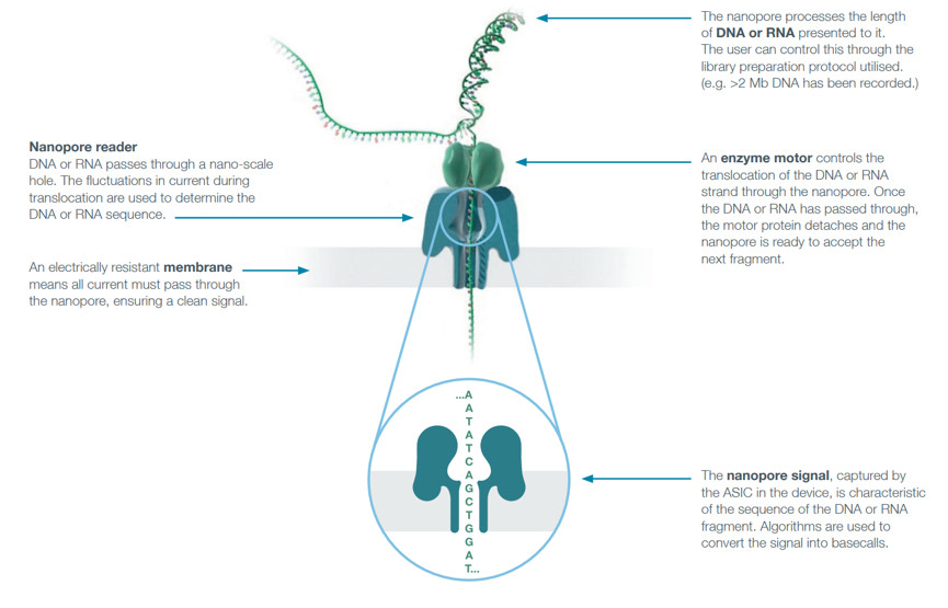 ONT sequencing is a single molecule real-time electrical signal sequencing technology based on nanopores, the sequencing principle of each platform is the same. Double-stranded DNA/RNA will bind to nanoporous protein embedded in the biofilm and unwinding under the lead of motor protein, under the action of voltage difference from both sides of the biofilm, DNA/RNA strands pass through the nanopore channel protein at a certain rate. Due to the differences of the chemical properties of the different bases on the DNA/RNA strand, when a single base or DNA molecule passes through the nanopore channel, it will cause the change of different electrical signals. By detecting and corresponding to these signals, the corresponding base types can be calculated and the real-time detection of the sequence can be completed.