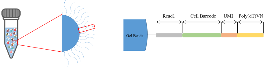 種類約為88萬種,每個膠珠之上有千萬級的探針,每條探針包括四個部分,通用測序引物R1,cell barcode,UMI,poly(dT)VN ,這里我們設(shè)計了更長的CB有54個bp,更長的CB可以更好的去兼容三代測序,尤其是ONT測序,可以提升識別效率。